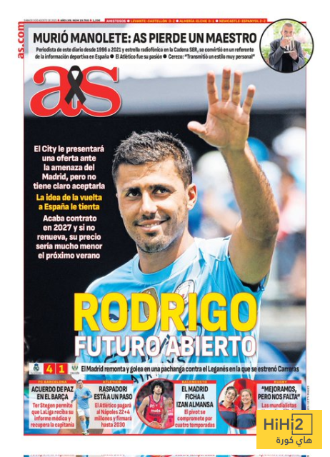 صورة رودري تصدرت غلاف صحيفة الاس اليوم السبت 9 اغسطس :