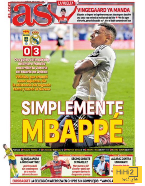 هاي كورة- فوز ريال مدريد 3-0 ضد اوفييدو في الجولة الثانية من الليغا تصدر الصحفة الاولى لصحيفة أس الاسبانية اليوم الاثنين 25 اغسطس .