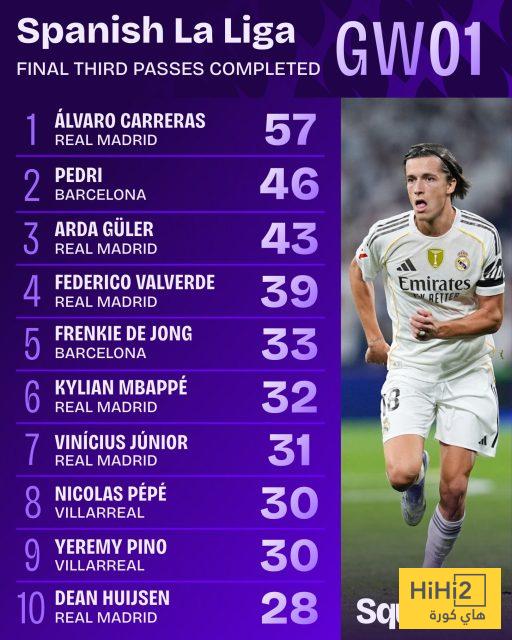 وبحسب إحصائية “سوفاسكور”، أتم كاريراس 57 تمريرة ناجحة في الثلث الأخير، متفوقًا على أسماء بارزة مثل بيدري (46) وأردا غولر (43) وفالفيردي (39).