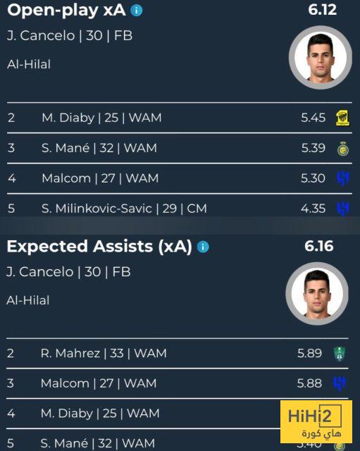 هاي كورة – تصدر البرتغالي جواو كانسيلو قائمة اللاعبين في دوري روشن من حيث صناعة الأهداف المتوقعة (xA) قبل إصابته في العضلة الخلفية الموسم الماضي، سواء من اللعب المفتوح أو إجمالي الفرص، متفوقًا على أبرز الأسماء الهجومية في البطولة.