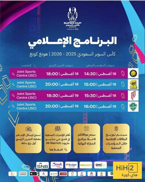 هاي كورة – أعلنت اللجنة الإعلامية لكأس السوبر السعودي في نسخته الحالية المقامة في هونغ كونغ عن جدول المؤتمرات الصحفية للفرق المشاركة وهي: “النصر، الاتحاد، القادسية، الأهلي”.